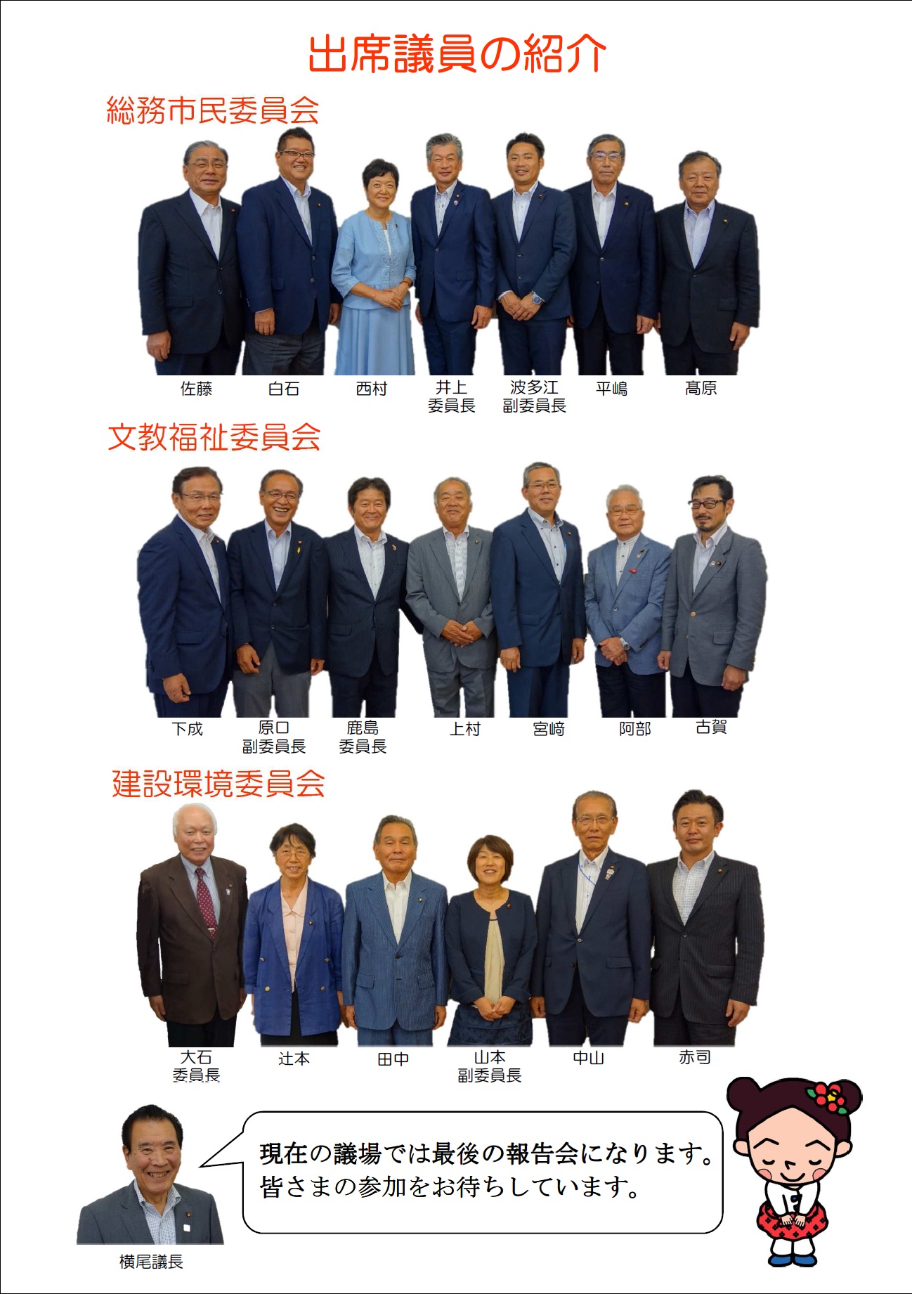 | 建設環境委員会 | 大石 泰、山本加奈子、田中 允、辻本美惠子、赤司泰一、中山雄夫 |