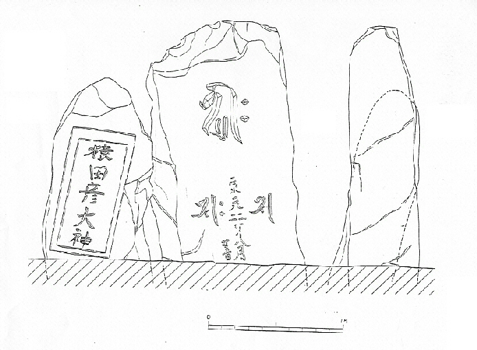 老松神社境内にあるもので、元々は鳥居のかたわらに建てられていました。近年の境内の整備に伴って、覆屋の中に移設されています。